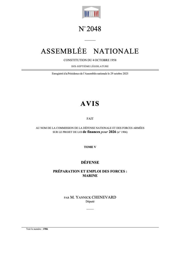Médiathèque et ressources Recherche Rechercher Filtre médiathèque TousDiscours (6)Rapport pour avis (4)Proposition de loi (3)Rapports (3) Rapport pour avisRapport budget Marine 202629 octobre 2025DécouvrirDiscoursDiscours Rapport budget Marine 202530 octobre 2024DécouvrirRapport pour avisRapport budget Marine 202530 octobre 2024DécouvrirDiscoursDiscours de Yannick Chenevard lors de la première Conférence Nationale Maritime4 avril 2024DécouvrirProposition de loiProposition de loi n°1146 adoptée en séance publique à l’Assemblée nationale27 mars 2024DécouvrirDiscoursDiscours de Yannick Chenevard, rapporteur de la PPL n°1146, à La Tribune de l’Assemblée nationale27 mars 2024DécouvrirRapportsRapport PPL n°114620 mars 2024DécouvrirProposition de loiProposition de loi n°1146, adoptée en Commission des Lois20 mars 2024DécouvrirDiscoursDiscours de Yannick Chenevard relatif au rapport budget Marine 2024 devant la Commission de la Défense25 octobre 2023DécouvrirRapport pour avisAvis Préparation Emploi des Forces Marine PLF 202425 octobre 2023Découvrir Voir la suite (6)